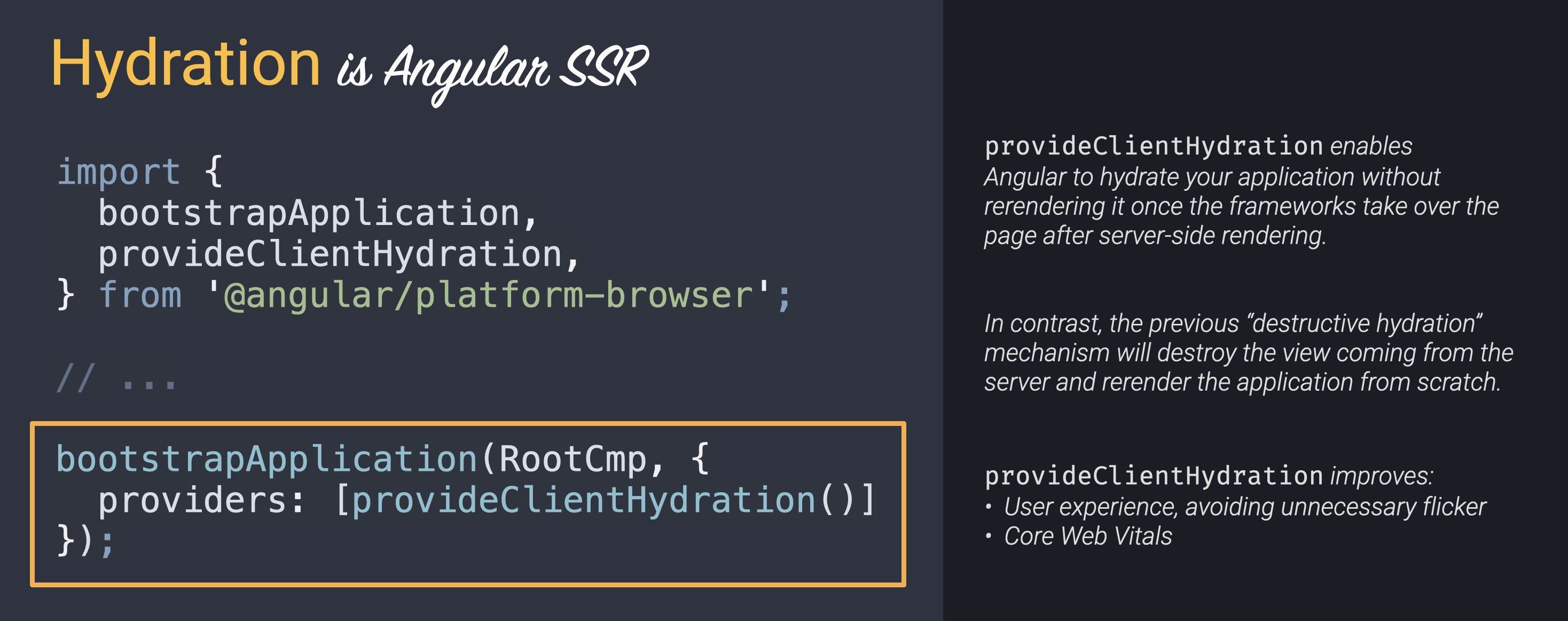 We just landed hydration in Angular! You can try it in the prerelease of v16 on Wednesday 🔥 - No flicker due to rerendering when using SSR - Better Core Web Vitals. 45% improvement in LCP based on early testing https://github.com/angular/angular/pull/49666