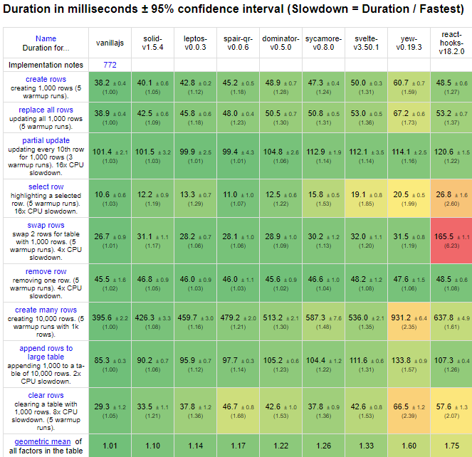 Rust WASM frameworks have been making some good progress in the last few months on rendering performance. Adopting Signals and Fine-Grained reactive rendering. They've almost caught up to @solid_js! (vanilla, Solid, Svelte, and React included as JS comparisons)