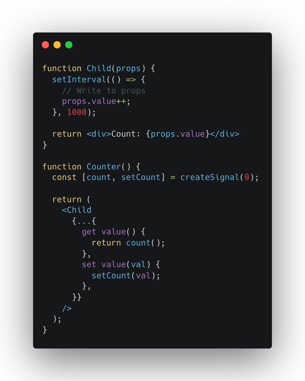 <Greeting name={name()} />// becomesGreeting({ get name() { return name() })<Greeting name={"John"} />// becomesGreeting({ name: "John" })